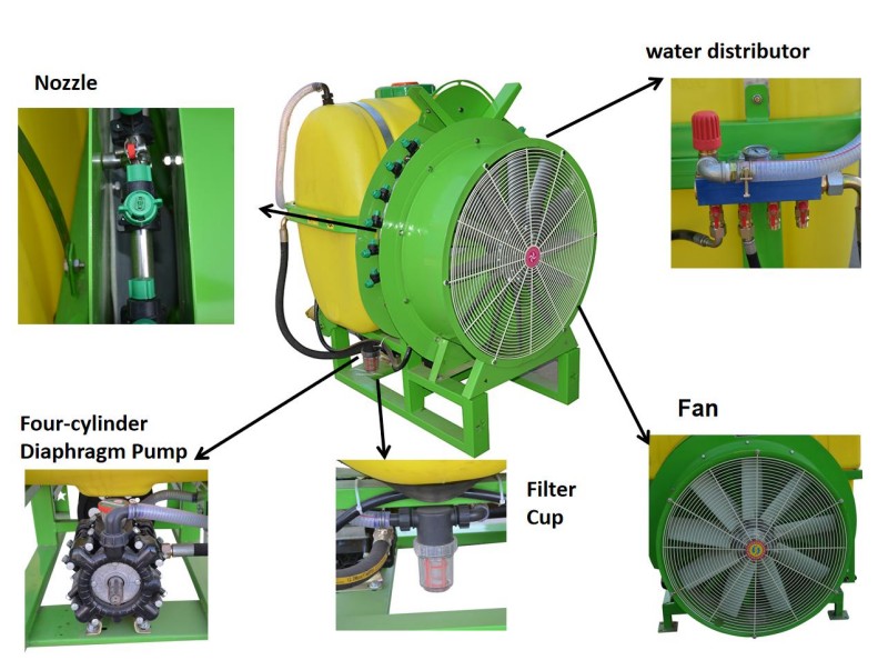 - Operation: Start the tractor and adjust to a speed of 3-8km/h; turn on the fan and spray pump, adjust nozzle angle and pressure based on tree height and density.
