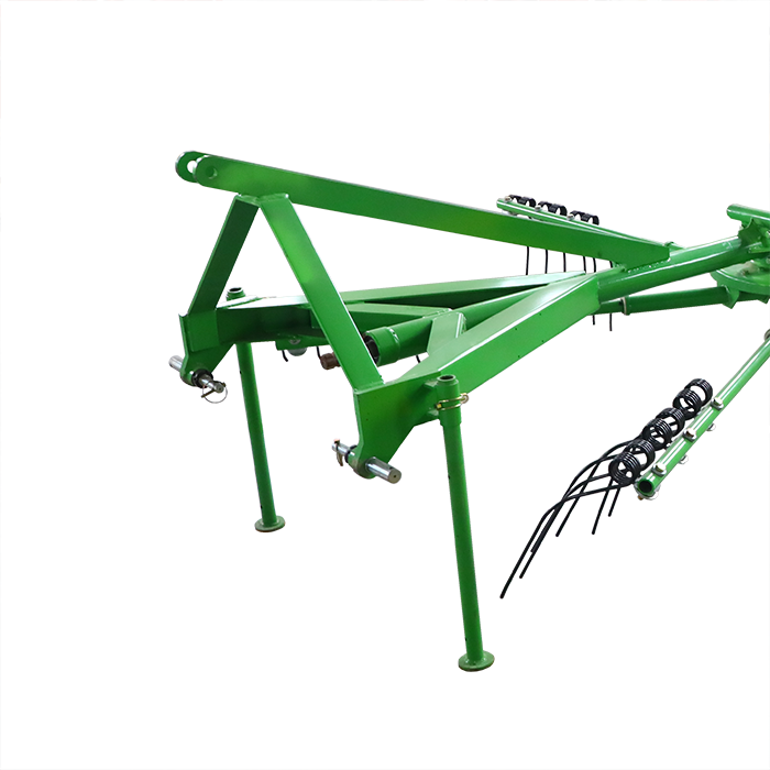 Rotary Hay rakes use the tractor's power take-off shaft as a power source, transmitting power to the gearbox via a drive shaft. After speed reduction, the power drives the central shaft of the rotating arm to rotate.Under the control of the cam-guided mechanism, the rotating arm drives the gear teeth to complete the raking and releasing of hay. The operation is scientific and efficient.During operation, the scooping teeth gather and spread hay as the rotating arm touches the ground, gently pushing it to one side to form hay strips, and then returning to the initial position to repeat the cycle. By adjusting the angle of the scooping teeth and working height, the hay gathering and spreading modes can be flexibly switched to adapt to hay with different levels of dryness.